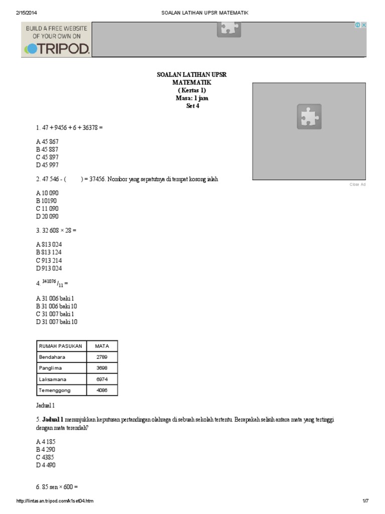 Soalan Latihan Upsr Matematik from lintasan.tripod.com Contoh soalan membuat inferens upsr. Text of contoh soalan upsr 2. Tips menjawab soalan wang upsr. Matematik upsr soalan kbat : Semoga perkongsian ini iaitu 50 contoh soalan pt3 2019 matematik sedikit sebanyak dapat memberikan informasi kepada anda semua khususnya kepada guru, ibu bapa dan calon yang akan menduduki pt3 2019. Kemahiran berfikir aras tinggi soalan matematik upsr. Jadi, demikianlah beberapa contoh soalan matematik psikometrik spa yang sempat dibincangkan dalam perkongsian ni. Home soalan upsr soalan latihan topikal matematik upsr.