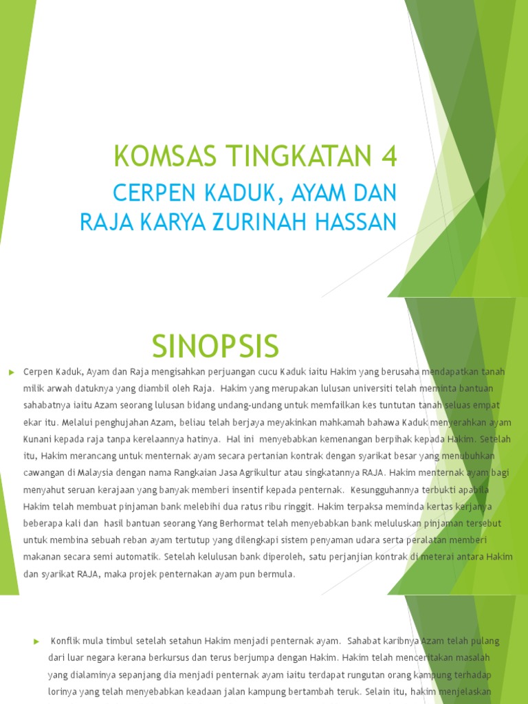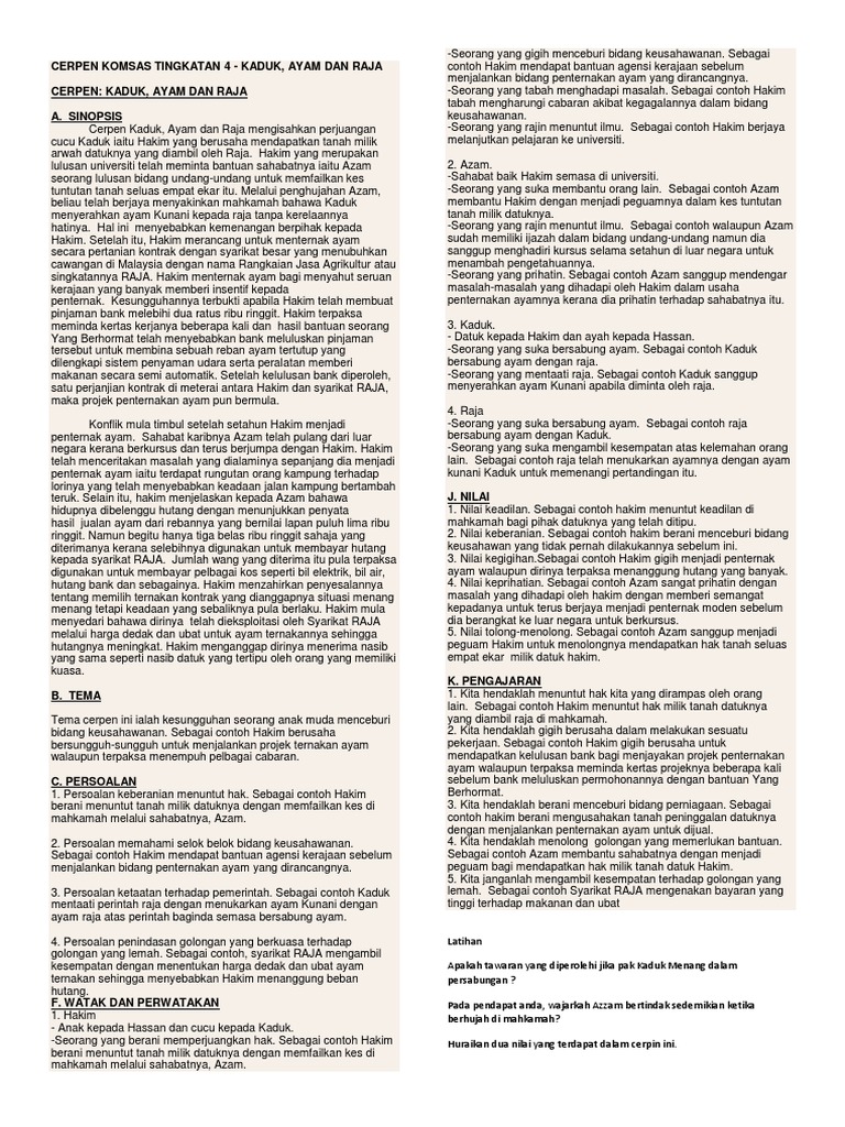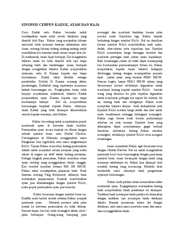Cerpen kaduk ayam dan raja smktpptm cs x264подробнее. Cerpen kaduk, ayam dan raja mengisahkan perjuangan cucu kaduk iaitu hakim yang berusaha mendapatkan tanah milik arwah datuknya yang diambil oleh raja. Kisah ini berlaku di negeri cempaka seri. Kaduk,ayam dan raja komsas tingkatan 4подробнее. Sinopsis the assent, penebusan dosa pendeta yang gagal melakukan pengusiran setan. Hakim berani menuntut tanah milik datuknya dengan memfailkan kes di mahkamah melalui sahabatnya, azam. Cerpen kaduk, ayam dan raja. Cerpen kaduk, ayam dan raja : Hakim melibatkan diri dalam bidang penternakan cerpen : Pembaca diperkenalkan dengan watak kaduk yang dianggap bodoh kerana bertukar ayam dengan raja. Raja merampas ayam kaduk walaupun ayam kaduk menang. Sebagai contoh kaduk mentaati perintah raja dengan menukarkan ayam kunani dengan ayam raja atas perintah baginda semasa bersabung ayam. Cerpen kaduk, ayam dan rajadraft.
